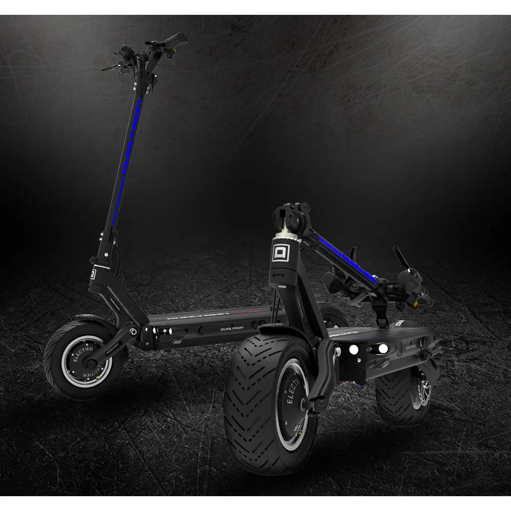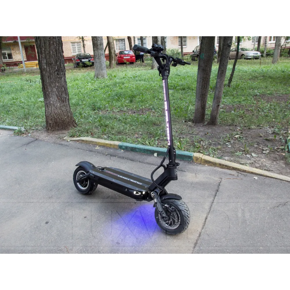 Статный, с добротной конструкцией, два двигателя на каждое колесо, мощность одного 2700 Вт, в сумме 5400 Вт это просто не реально, скорость которую может развить этот агрегат 85 км/ч. Для таких скоростей нужны хорошие тормоза, два гидравлических, ABS система. При торможении происходит дополнительная зарядка аккумулятора. Один мотор можно отключить и наслаждаться спокойной ездой. Для такого самоката нужны хорошие колеса, диаметр равен 11 дюймов.