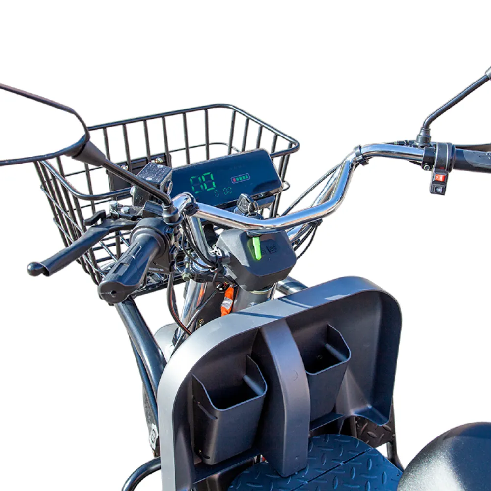 Электротрицикл оснащен мощным двигателем мощностью 1000 Вт, что обеспечивает достаточную мощность для перевозки грузов весом до 200 кг. Привод задний, что позволяет обеспечить хорошую устойчивость и маневренность при движении.