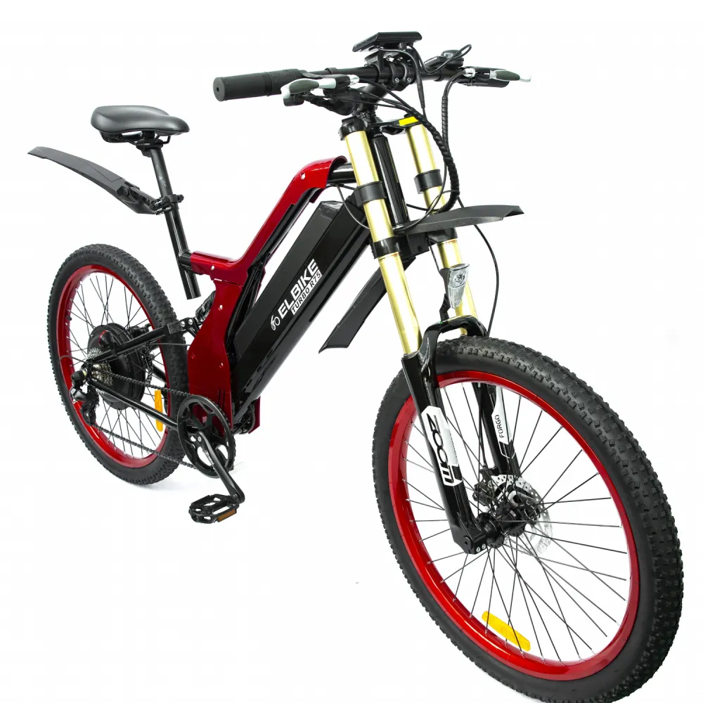 Представляем вашему вниманию электровелосипед Elbike TURBO R65 премиум класса. Значительный размер колёс в 26 дюймов, яркий красный цвет, мощность мотора 500 Вт. Электровелосипед буквально кричит о том, что готов ездить в экстремальных условиях.