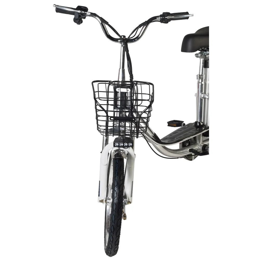 Основное и дополнительное сидения изготовлены из воздухопроницаемого покрытия, которое позволит долго находится в дороге. Для доставки негабаритных грузов и покупок на руле предусмотрена вместительная корзинка, а максимальная грузоподъемность рассчитана до 200 кг.