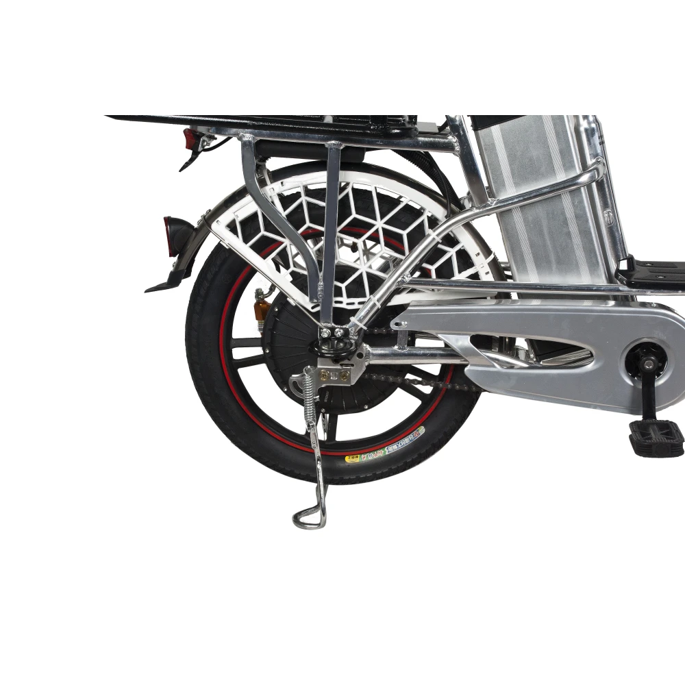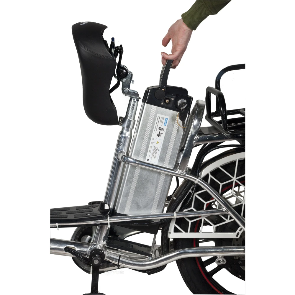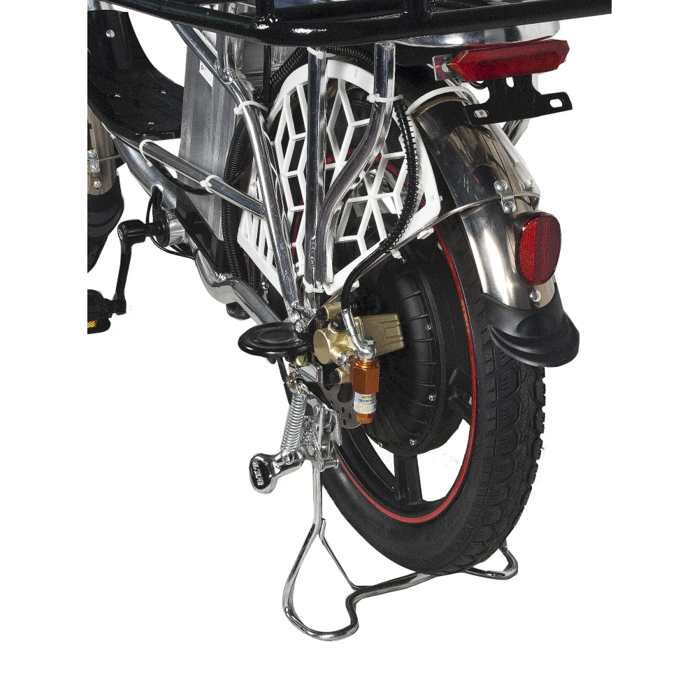 Электровелосипед изготовлен из сверхпрочного алюминия, не теряющего первоначальных характеристик при соблюдении требований производителя. Оснащена мотором мощностью 500 Вт, который в сочетании с емкой АКБ способен развивать скорость до 20-50 км/час и преодолевать до 80 км пути. Гидравлическая тормозная система, профессионализм райдера и надежно сцепляемые с грунтом внедорожные колеса обеспечивают безопасность движения райдера.