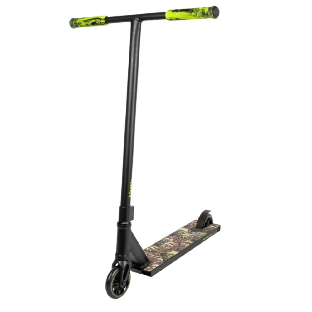 Транспортное средство весом 4,25 кг оснащено Т-образной рулевой системой, изготовленной из хромолевой стали. Высота руля – комфортная для выполнения сложных и легких трюков, составляет 88,5 см. Дека широкая, удобная для стоп, не допускает неверных движений и соскальзывания. Колесная часть полиуретановая, долговечная.